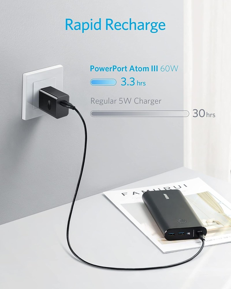 - طاقة شحن ضخمة: يوفر منفذ USB-C بقدرة 45 واط طاقة كافية لشحن اللاب توب بأقصى سرعة، بينما يوفر منفذا USB بقدرة 15 واط شحنًا مثاليًا للهواتف والأجهزة اللوحية والمزيد.